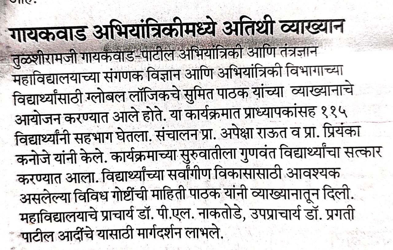 | Forum Re-installation and Guest Lecture on “How to Succeed in IT Industry” | 02-Aug-24 | Mr. Sumit pathak | Senior Manager, Global Logic, Nagpur | 115 | PO2,PO6, PO7,PO8,PO9,PO10 | |