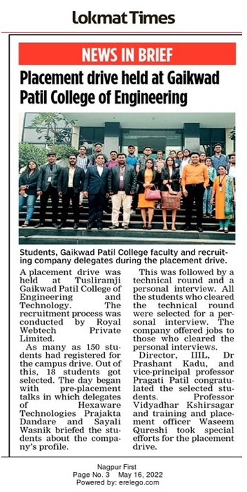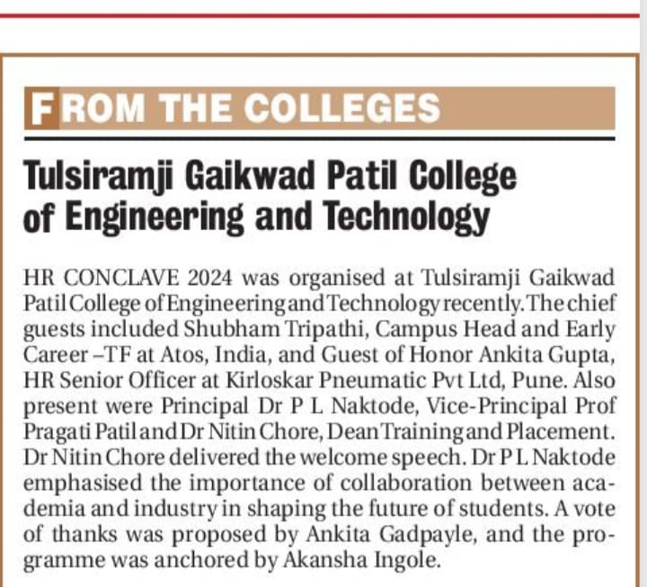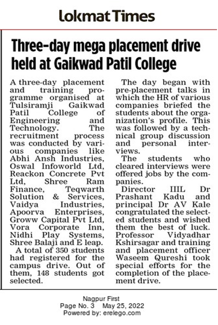 It is a pleasure to welcome you to the Training & Placement Department of Tulsiramji Gaikwad-Patil College of Engineering & Technology, Nagpur (TGPCET). Globally accepted as a vibrant seat of academic and professional excellence, Tulsiramji Gaikwad-Patil College Of Engineering & Technology, Nagpur is known for its innovative approach, participative culture and academic rigor. Our college bestows its rich heritage and knowledge through one of the top faculties in India on the students and gives them an opportunity to carve a new path in their lives. It is indeed a matter of great pride that Tulsiramji Gaikwad-Patil College of Engineering & Technology has been awarded with International Accreditation (IAO).