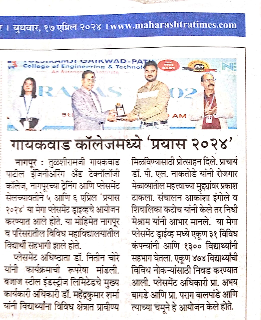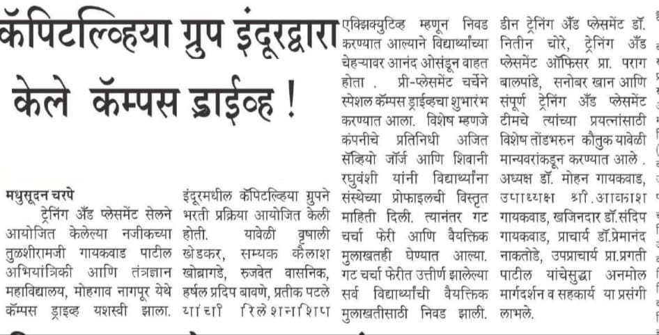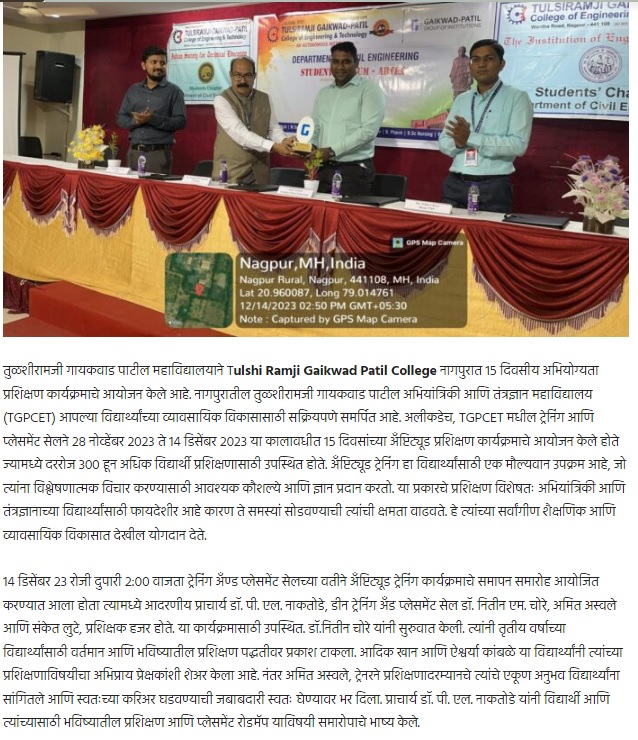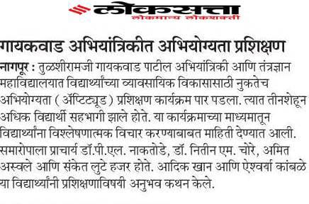 It arranges training for students in industries for 3-4 weeks at the end of 4th Semester and for 6 months in 6th, 7th or 8th Semester. All the Engineering Department students undergo Six months training. The students of the college undergo their training at various prestigious organizations as Akashwani, Reliance Power Plant MIDC, A A Energy Ltd, Abhijit Energy Power Plant, Miracle Technologies, IMGIS. Pvt. LTD, Jindal Steel Works Mumbai, etc. The students act as a channel of communication with industries.